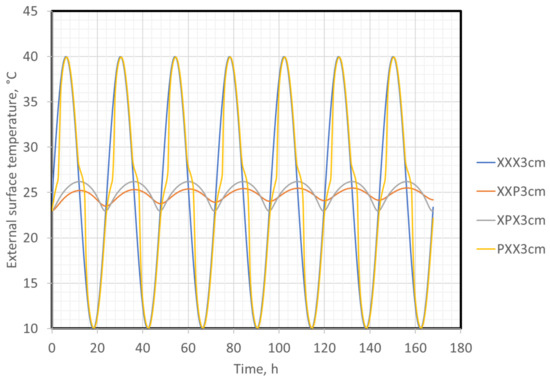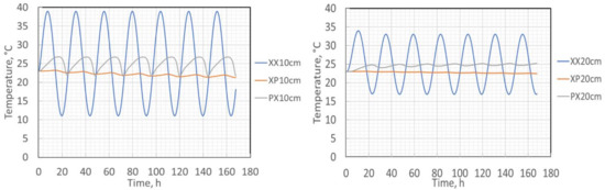 Figure 15 shows, with a wall configuration of PP10 cm, that the internal surface temperature varies during the period by about 1 °C. However, a wall configuration of XX20 cm shows a significant variation of the internal surface temperature (17 °C during the period). With a wall configuration XX75 cm, a similar variation with that of PP 10 cm, was achieved. Additionally, wall configurations of PP20 cm and XX100 cm result in a more stable internal surface temperature.