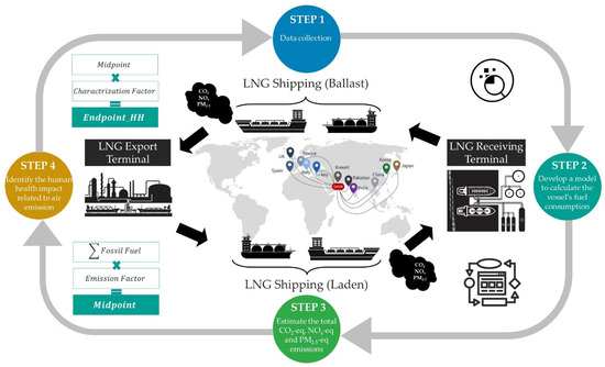 The first step starts with data collection, including these items: the annual LNG demand for Qatar’s main customers, carrier’s design details and capacities, traveling distances and ports details, laden and ballast traveling details and their relevant fuel consumption during each operation process, and the ballast water loading and unloading details. This research selected four specific types of ships by considering actual ship transits from departure port to 11 destinations. The model reflects the nature of the carriers and their suitable fuel type. Mixing of such ships to a destination was not deemed for the per roundtrip and per year emissions. The second step contains developing a modeling tool to measure the carrier’s fuel consumed for multiple situations involving 11 different destinations worldwide. In the third step, the average CO2-eq, NOx-eq, and PM2.5-eq pollutants are then calculated utilizing the total fuel consumed and the relevant emission factors. The fourth step presents CFs from ReCiPe 2016 to convert the environmental emissions to endpoint human health impact. CO2-eq, NOx-eq, and PM2.5-eq represent the critical pollutants related to human health impact as per ReCiPe 2016 that are expected to occur during maritime LNG transportation. The rest of the emissions defined in ReCiPe 2016 can be neglected, as they don’t have a critical contribution towards human health impact in maritime LNG transport.