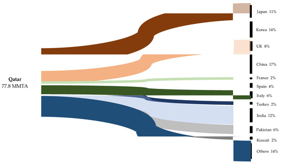 As shown in Figure 2, the proposed tool for air pollution footprint accounting was used for LNG trade between 11 different destinations of Qatar’s LNG key customers. Qatar was chosen because of its high LNG production rate and ability to export LNG to other countries through maritime transport. Furthermore, Qatar Petroleum (QP) declared the North Field Expansion (NFE) mission in November 2019, which will raise Qatar’s LNG output capability to slightly more than 100 million tons per annum (MTPA) as the first expansion phase. The second phase is to increase 126 MTPA, known as the North Field South (NFS) mission, reflecting around a 63% increase compared with the current capacity [41]. Asian countries represented by China, Korea, India, and Japan are the highest beneficiary of Qatar’s LNG export at 17, 14, 12, and 11%, respectively [42].