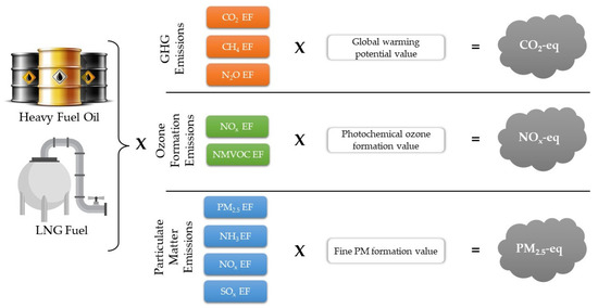 For every ship type, the air emissions calculation methodology is assessed in the model following Figure 3. Emission factors for global warming emissions equivalent (CO2, CH4, and N2O), photochemical ozone formation equivalent (NOx and NMVOC), and fine particulate matter formation equivalent (NH3, NOx, SO2, and PM2.5) are considered.