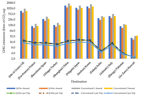 The results of the GHG emissions correlated with the type of fuel used and the supply destination are summarized in Figure 4 for both the annual and per roundtrip emissions. Kuwait has demonstrated the lowest CO2-eq emissions for both the yearly and per roundtrip values given the short destination from the origin (Qatar). Whereas Japan has been shown the highest per roundtrip CO2-eq emissions, China has indicated the highest annual CO2-eq emissions. Conventional-2 showed the lowest per roundtrip CO2-eq emissions in terms of fuel type, followed by Q-Max, Q-Flex, and finally Conventional-1. However, the annual CO2-eq emissions demonstrated different results, with Q-Max having the lowest CO2-eq yearly emissions followed by Q-Flex, Conventional-2, and Conventional-1. These results indicated the general trend with some exceptions for the case of Kuwait. Hence, the results can be proposed to use Q-Max or Q-Flex fuel types for short distances trips. Whereas, for long distances, it is better to use Q-Max or Conventional-2.
