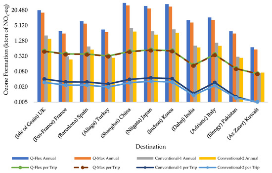Similarly, the ozone formation emissions results have revealed differences based on the type of fuel used and the supply destination, as summarized in Figure 5. Kuwait has demonstrated the lowest NOx-eq emissions for both the annual and per roundtrip values given the short destination from the origin (Qatar). On the other hand, Japan has demonstrated the highest per roundtrip NOx-eq emissions, and China has indicated the highest annual NOx-eq emissions. Conventional-2 indicated the lowest per roundtrip NOx-eq emissions in terms of fuel type, followed by Conventional-1, Q-Max, and finally Q-Flex. However, the annual NOx-eq emissions which are influenced by the number of trips yearly, demonstrated different results, with Conventional-2 having the lowest NOx-eq yearly emissions followed by Conventional-1, Q-Max, and Q-Flex. These results indicated the general trend with some exceptions for the case of Kuwait as it has the shortest traveling distance. Hence, it can be advised to use Conventional-1 fuel types for short-distance trips from the findings. Whereas, for long distances, it is better to use Conventional-2.