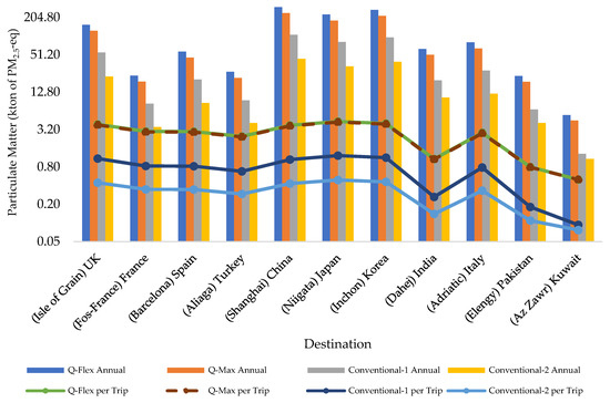 The third type of emissions results, particulate matter, as illustrated in Figure 6, have revealed more distinguishable observations as per the type of fuels used and the supply destination. Kuwait has demonstrated the lowest PM2.5-eq emissions for both the annual and per roundtrip values given the short destination from the origin (Qatar). On the other hand, Japan has demonstrated the highest per roundtrip PM2.5-eq emissions, and China has indicated the highest annual PM2.5-eq emissions. Conventional-2 indicated the lowest per roundtrip PM2.5-eq emissions in terms of fuel type, followed by Conventional-1, Q-Max, and finally Q-Flex. However, the annual PM2.5-eq emissions demonstrated different results, with Conventional-2 having the lowest PM2.5-eq yearly emissions followed by Conventional-1, Q-Max, and Q-Flex. These results indicated the general trend for all the destinations, and the distance plays a significant factor in the variation of emissions. Hence, from the results, it can be suggested to use Conventional-2 fuel types for short and long distances associated with lower PM2.5-eq emissions.