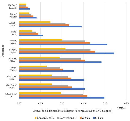 The midpoint and endpoint emissions results have been converted to the human health impact potential associated with the type of fuels used and the supply destination, as illustrated in Figure 7. Figure 7 represents the annual social human health impact per the unit of LNG shipped by each type of carrier. The figure provides the calculated factor that can be used to measure the daily effects on human health related to LNG shipping through the sea. The factors consider the distance and number of trips annually and the annual demand per location. Moreover, these factors can help the researchers to estimate the annual social human health impact from the air emissions that are related to LNG shipping to these 11 destinations and provide guidance on the carrier type that can be utilized for shipping to each destination and transportation planning to satisfy customer needs and reduce the possible air emissions and perhaps the social human health impact.
