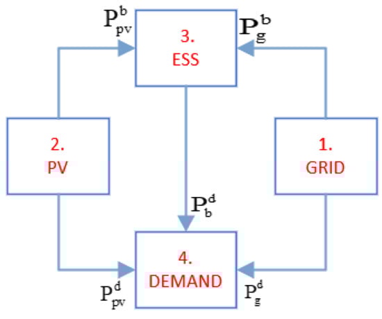 A schematic of the grid-tied microgrid under study is shown in Figure 1. The main components of the hybrid system are the PV, ESS and local load. The power flow within the microgrid is illustrated in Figure 2. The grid connection is represented in the first node and the imported power from the grid, , at time is used for the charging of the ESS in the third node and directly supplies the load demand in the fourth node. The second node is the PV supply source, which can also be used to charge the ESS and supply the load demand. The energy demand at all times is met by a combination of power from the PV, denoted as power from the ESS, , and power from the grid, as described in (1):