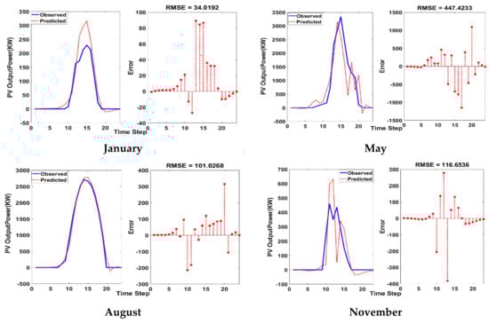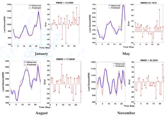 This paper uses LSTM-based deep learning for predicting the load demand and the PV generation for the future, considering one year of historical data from the Ushant Island in France. LSTM networks are a type of Recurrent Neural Networks (RNNs) with modules typically referred to as cells rather than neurons, and they contain series of gates. Each LSTM cell has a form of longer-term memory in the form of a cell state that is updated throughout time [19]. The LSTM model is trained with the root-mean-squared error (RMSE) loss function, Adam optimizer and a maximum of 300 epochs with a single gradient threshold. RMSE indicates the deviation between the predicted value and the measured value, and it is a measure of the forecasting error [20]. The PV generation and load demand are predicted for the last day in each month of the year. Before training or testing a neural network, the training and testing data must go through a series of pre-processing steps. Normalization was applied here as the pre-processing method, which reduces the effect of different scaling of the collected data, including interpolating any missing data points and organizing the data (historical PV generation and load demand) in a chronological form [21]. The normalized data are then used as an input to the LSTM network. The initial predicted PV output power and load demand for the last day of January, May, August and November are shown in Figure 3 and Figure 4 respectively, with the RMSE indicating the accuracy of the predictions. To forecast the values of future time steps of the sequence, the training sequence with values shifted by one time step is specified as the response. This means that at each time step of the input sequence, the LSTM network learns to predict the value of the next time step. To predict the next time step, the previous prediction is used as an input to the function [22].