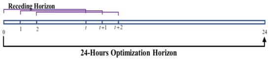 The RH strategy is a concept adopted from model predictive control (MPC), which operates by using online model-based optimization to determine the current control action [23]. It is a general-purpose control scheme that involves repeatedly solving a constrained optimization problem, using predictions of future generation and demand over a moving time horizon to choose the control action. The RH control handles constraints, such as limits on control variables, directly and naturally, and generates precisely calculated control actions, respecting the constraints. The basic RH policy is very simple. At time t, we consider an interval extending T steps into the future: t, t + 1, …, t + T, as shown in Figure 5. We then carry out several steps. For power system scheduling problems with high dependency on the forecasted values of renewable energy productions and demand, this method has been found to effectively correct errors in the prediction of renewable energy generation and load in future iterations [24]. At each hour, the economic dispatch of the battery is obtained using 24 h data of predicted future renewable energy production and demand using the LSTM network, as explained in Section 2.2. The optimization outputs are 24 h of dispatch commands, as summarized using the matrix in (22) as: