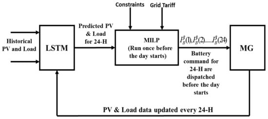 In this paper, the RH control strategy is utilized to perform the optimization every hour and the LSTM predicts the PV generation and load data for 24 h. The optimal dispatch problem is solved using the MILP algorithm and the dispatchable battery commands for the first hour are applied in real-time. The real data are then used to update the LSTM input and the process is repeated for future time windows. With this approach, the EMS can mitigate the undesirable challenges associated with the PV generation’s stochasticity and real-time power imbalances.