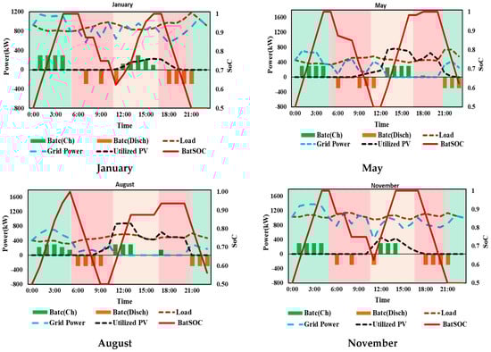 The results of the simulations for the microgrid dispatch are shown in Figure 8 when the battery charge/discharge cycle was limited to two for January, May, August and November, representing the four seasons of the year, with background colors representing the ToU tariff regions. Since the battery charge/discharge cycle is limited to two using (15)–(19), the battery starts charging at the beginning of the day when the ToU tariff is at its lowest rate (the green region), discharges when the ToU tariff is at its highest rate (the red region) and starts charging again when PV power becomes available or during the mid-peak ToU tariff (pink region), and finally discharges during the second peak of the ToU tariff. This charge/discharge pattern of the battery is consistent throughout the year and makes it easy to calculate the life of the battery ESS based on the standard lifecycle vs. the depth of discharge (DOD) curve of batteries.