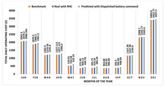 A day-ahead schedule based on an offline optimization was performed with the predicted PV power and load demand for the second scenario using the MILP optimization approach. The MILP module, as shown on the EMS flow model in Figure 7, calculates the set-points for the dispatchable resources 24 h ahead based on predicted resources. The grid and the ESS are the dispatchable energy resources, which means the power output can be controlled while the PV system and the load demand are varying resources or non-dispatchable resources. The ESS command obtained from the offline day-ahead optimization was implemented in real-time on real data, as shown in Figure 7. The daily operating cost for the 24 h horizon was calculated. To evaluate the effectiveness of the proposed approach, the simulations were performed for the last day of every month, the monthly historical data were trained using the LSTM network and the last day of the month was predicted. Both scenarios were tested every month, and the daily optimal operating cost was compared against a benchmark in which the forecasted data are the same as the real data. This is a non-practical situation, but it will help us to evaluate the effectiveness of the two scenarios. Figure 9 shows the daily optimal operating cost of the microgrid for the last day of every month of the year, for the benchmark, the real-time with RHC and the offline optimization using predicted data. The simulation results show that the operating cost of the proposed real-time strategy outperformed the offline optimization strategy by 3.3%. The details of the total percentage difference between the two scenarios and how close they were to the benchmark are shown in Table 5.
