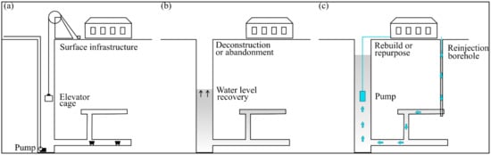 Underground mines usually required ongoing pumping of inflowing water to maintain dry mining conditions. Their closure, cessation of pumping, and recovery of minewater toward pre-mining levels has presented one of the greatest challenges associated with the industry’s downturn [27,28]. Subsequent risks of contaminated aquifers [29], CMD [30], watercourse pollution and ground instability [31] require monitoring and mitigation. Such mitigation often involves the continued abstraction of minewater to maintain acceptable water levels. This is associated with considerable pumping and treatment costs, but the pumped water can also represent a low-carbon geothermal resource for heating and cooling, which can offset these costs and potential environmental liabilities [13,32]. A summary of progression from active coal production to repurposing for MWG is depicted in Figure 1.