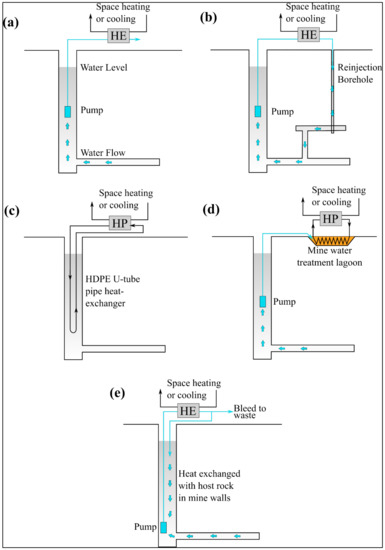 Configurations of Minewater Geothermal Energy Systems: (a) Open system with discharge; (b) Open system with reinjection; (c) Borehole Closed loop; (d) Surface closed loop; (e) Standing column. Reprinted (with modifications) with permission from ref. [40]. Copyright 2016 David Banks.