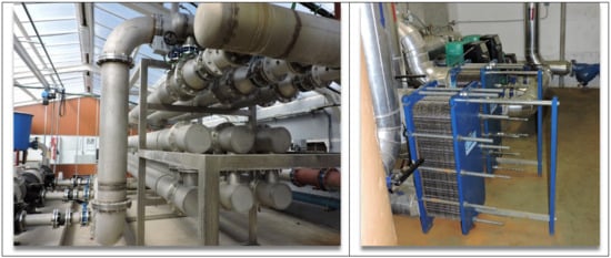 The 3.9 MW system installed in Mieres (L,V), Asturias, Northern Spain (5.7747° W, 43.2428° N) is a well-functioning, well-reported example of the scale of heating and cooling provision which can be achieved through MWG energy. It delivers heating and cooling to public buildings via two 352 kW heat pumps at a university, one 652 kW and two 1.2 MW heat pumps at a hospital and a 100 kW heat pump operating at the Asturian Energy Foundation (FAEN) [51]. Water is pumped, using four submersible pumps, at a rate of around 100 L/s from the 362 m deep Barredo coal mine shaft, in order to control minewater levels in the regionally interconnected complex of workings [51,81]. The pumped minewater temperature is around 23 °C [40,82]. The majority of the minewater flow is passed through an array of shell-and-tube heat exchangers (Figure 5), where heat is exchanged with an intermediate heat transfer fluid circuit, running around 1.9 km to the heat pumps in the plant room of the Álvarez Buylla hospital. The ratio (heating and cooling provided)/electricity consumed for the hospital system was reported as between 7.6 and 7.9 in the years 2015–16 [83]. A smaller portion of the minewater is directed to the University plant room, where heat is exchanged via plate heat exchangers and thence to the University’s “Edificio de Investigación” heat pump array. Following heat exchange, all the minewater is discharged to the Rio Caudal river, which classifies the scheme as “open system with discharge”. The minewater chemistry is relatively mineral-rich (mean total dissolved solids 1200–1400 mg/L), but iron-poor (mean iron 1.1 to 1.6 mg/L depending on depth of pumping), and is consistent throughout the connected mine system [51]. The iron content has caused some minor issues with clogging of the University plate heat exchangers, which were able to be disassembled, cleaned and returned to service [51]. The shell-and-tube heat exchangers have hitherto appeared less prone to clogging issues. The mine system is being explored for Underground Pumped Hydroelectric Energy Storage and Compressed Air Energy Storage plants in addition to the established MWG scheme [84].
