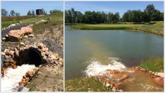 The pumped mine water discharge from Ewa shaft in Bytom, Poland (left), and its outfall into a lake within the ARMADA housing development complex (right). Reprinted with permission from ref. [70]. Copyright 2017 David Banks.