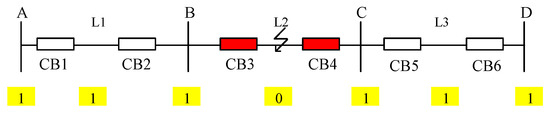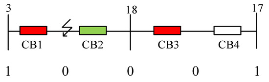 In Figure 1, if a fault occurs on line L2, it will lead to operation of the main protection and trip circuit breakers CB3 and CB4 to isolate the fault. According to the criterion (1), the line current meets the criterion. The line is outage and marked with 0. According to criterion (2), the bus voltage and do not satisfy the criterion. The bus is charged and marked with 1. As shown in Figure 1, one side of CB3 is power off and the other side is power on. CB4 is similar to CB3. CB3 and CB4 are fault area boundary breakers.
