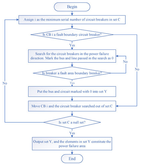 After the failure of the system, the dispatching terminal will receive the alarm information of the breaker and form the action circuit breakers set C. In order to effectively avoid the impact of breaker information loss and distortion, after the identification of the fault area boundary breaker in Section 2, this section verifies the action circuit breakers set C obtained at the dispatching terminal through the comprehensive application of the electrical quantity and switching value. The final fault area is formed by fault area boundary breakers. The specific steps of fault area formation are shown in Figure 2.