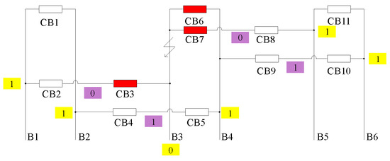 A double-bus-system is taken as an example to illustrate the fault area formation algorithm. As shown in Figure 3, if a fault occurs on bus B3, the bus protection will trip the circuit breakers CB3, CB6, and CB7 connected to the fault bus. Among them, the yellow shading number represents the bus charging conditions, and the purple shading number represents the line charging conditions.
