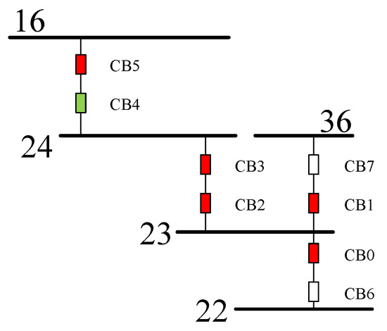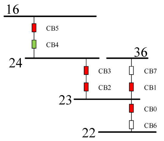 As shown in the following Figure 15, suppose that double faults occur at the bus B23 and the line L16-24. The fault at bus B23 leads to the operation of main protection and trips the breakers CB0, CB1, and CB2. The fault at the line L16-24 leads to the operation of main protection and trips the circuit breakers CB4 and CB5. The remote backup protection maloperation of line L23-24 trips the breaker CB3. The alarm information of breaker CB4 is designed as the missing alarm information in this case. Considering the electrical quantity and switching value, the final fault area is determined as shown in Figure 16.