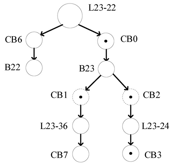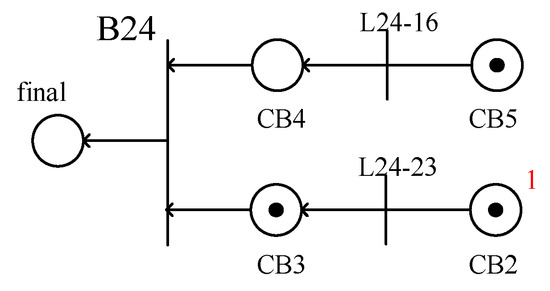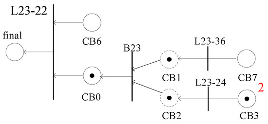 Based on the information connection tree shown in Figure 6, the backward reasoning Petri net shown in Figure 7 can be established. Among them, the remote backup protection of L23-24 operates and trips the breaker CB3, so the CB3 place has a token, and the protection extension coefficient 2 is marked at the upper right corner of the place. The breaker CB0 acts, but there is no relevant protection information. It is represented as the token contained in the corresponding place, but there is no protection extension coefficient. The breakers CB1 and CB2 are circuit breaker reverse nodes, and the related places are represented by dotted lines. Both circuit breakers operate, and then both places contain a token. In this case, the breaker action information and related protection action information of CB6 and CB7 are not received, so circuit breakers are only represented as the place.