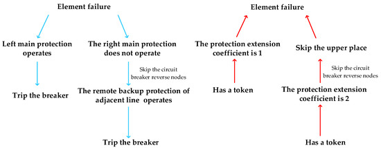 Correspondingly, the extension coefficient of the main protection and near backup protection can be recorded as 1; the extension coefficient of the remote backup protection and circuit breaker failure protection can be recorded as 2. However, in the backward reasoning Petri net, only the protection extension coefficient corresponding to the protection action caused by this element is recorded. For example, when a line fails, if the main protection of the line does not operate, the corresponding circuit breaker is tripped by the main protection of the bus. In the backward reasoning Petri net diagram of the line, the extension coefficient of the corresponding protection of the circuit breaker is still recorded as 0.