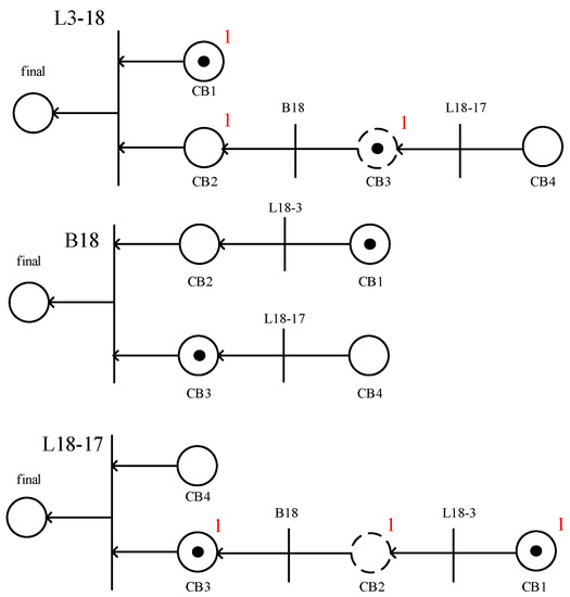 After the fault area is determined, the element set includes L3-18, B18, and L18-17. The backward reasoning Petri net is established by integrating the protection state information and circuit breaker state information at the dispatching terminal, as shown in Figure 12 below.