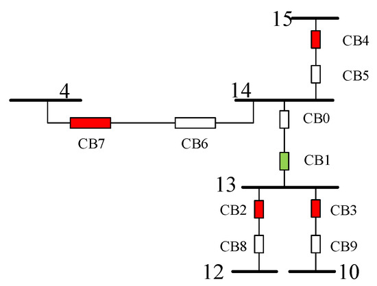 As shown in the following Figure 13, suppose that double faults occur at the bus B13 and the line L13-14. The fault at bus B13 leads to operation of the main protection and trips the breakers CB1, CB2, and CB3. The fault at the line L13-14 leads to the operation of main protection and trips the circuit breakers CB1 and CB2, but CB2 fails to operate. The remote backup protection of the adjacent line L14-15 operates and trips the breaker CB4. The remote backup protection of the adjacent line L4-14 operates and trips the circuit breaker CB7. The alarm information of breaker CB1 is designed as the missing alarm information in this case. Considering the electrical quantity and switching value, the final fault area is determined as shown in Figure 14.