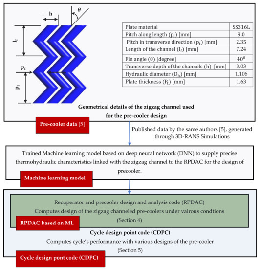 In the novel , the role of the pre-cooler is critical [1,19]. It serves as a sink and regulates the temperature and pressure settings at the compressor’s inlet. The compressor’s inlet temperature is envisioned to be kept close to the critical temperature of to accomplish superior cycle efficiencies [20]. At the same time, remarkably high values of the specific heat capacity of near its critical point (nearly forty times higher compared with water) require exceptionally high mass flow rates of the coolant (water) [21] to realize the anticipated exit temperatures of . Subsequently, the power required to pump the coolant becomes high enough to disparage the cycle’s efficiency. This problem can only be mitigated by exploring new channel geometries with enhanced thermohydraulic characteristics. Moreover, currently lacks investigations on the enhancement of the thermohydraulic performance of pre-coolers using efficient channel geometries. Currently installed facilities, and available numerical work on the topic, focus on printed circuit heat exchangers (PCHEs) with straight channel geometries. However, it was reported [6,10] frequently in the literature that PCHEs with straight channels exhibit significantly low thermal and hydraulic characteristics compared with zigzag and airfoil channel-geometries. One of the reasons why pre-cooler’s designed with the aforementioned channel geometries were never explored was the unavailability of their thermal and hydraulic characteristics in the pre-cooler’s operating regime due to limited lab facilities and intricacies linked with swift variations in the thermophysical properties near the critical point. Given this, the proposed study focuses on the design and optimization of the pre-cooler geometry employing PCHEs with zigzag channels. To achieve this, an in-house recuperator and pre-cooler design and analysis code (RPDAC) is developed in the environment of the MATLAB©. The complex thermal and hydraulic characteristics linked to the zigzag channel geometries operating very close to the critical point are incorporated through a trained machine learning (ML) model. The ML model is based on the deep neural network (DNN) trained using the CFD data published by the same authors [5]. The in-house code is linked with the in-house cycle design point code (CDPC) to analyze various designs of the zigzag channeled pre-cooler on the performance of the recompression supercritical carbon dioxide Brayton cycle . Finally, the multi-objective genetic algorithm (MOGA) is used to optimize the pre-cooler’s geometry in the environment of the power cycle. Hence, the objective of the current study is to design and optimize the zigzag channeled pre-cooler by utilizing a deep neural network (DNN) and in-house codes, i.e., the recuperator and pre-cooler design and analysis code (RPDAC) in the environment of the sCO2-BC by coupling the RPDAC with the cycle design point code (CDPC) and multi-objective genetic algorithm (MOGA).