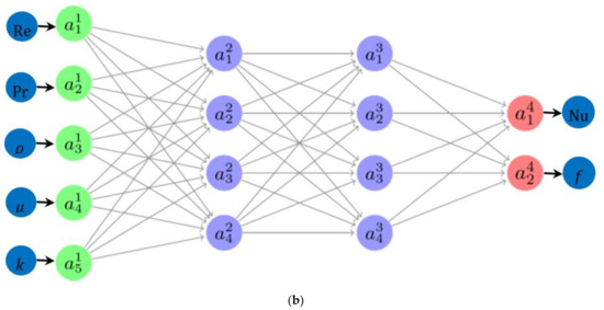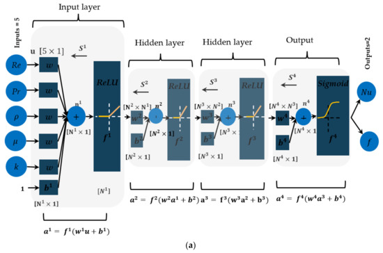 The construction of the DNN is such that it moves the information iteratively in forward and backward directions, as shown in Figure 2a. The Figure elucidates the construction of a deep neural network with two hidden layers and a layer each for five inputs and two outputs. All the hyperparameters linked with the DNN (number of the hidden layers, number of the neurons in each layer, activation function, and optimization function) were optimized to obtain minimum values of the root mean squared (RSM) error. The deep neural network (DNN) with two hidden layers consisting of four neurons in the first and second layers provided the minimum values of RSM error without overfitting the data where Levenberg–Marquardt (L.M.) is identified as the optimal training function. Several activation functions were tested where the rectifier linear unit (ReLU) is found appropriate for the input and the two hidden layers. At the same time, the sigmoid is identified as a suitable activation function for the output layer, as shown in Figure 2.