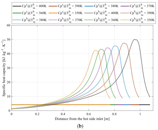 The sharp variation in the properties of CO2 (Figure 5a) demonstrates that the precise implementation of the properties is mandatory for the realistic designs of the recuperator and pre-cooler in RPDAC. In this reference, NIST’s REFPROP [24,25] is coupled with the RPDAC through a subroutine.