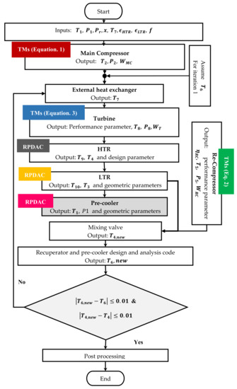 The numerical model for the mainly comprises the sub-models for turbomachinery (compressor and turbine) and heat exchanger models. The recompression consists of four heat exchanger intermediate heat exchangers, a high-temperature recuperator (HTR), a low-temperature recuperator (LTR), and a pre-cooler. Turbomachinery of the cycle is modeled using turbomachinery models (TMs) based on the fixed isentropic efficiencies Equations (8)–(10) provide. On the other hand, detailed models for the heat exchanger are required for the current for accurate calculations [6,27]. Therefore, to model HTR, LTR, and the pre-cooler, an in-house recuperator and pre-cooler design and analysis code (RPDAC) is developed and used in the current work. The details of the RPDAC are provided in Section 4.