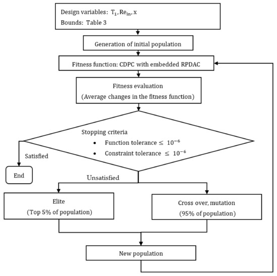 The schematic of the methodology opted for the employed optimization problem is displayed in Figure 9. The list of design variables with their upper and lower bounds are listed in Table 3. The procedure begins by random initialization of a defined population size of 100 combinations of the input variables. The generated population is then examined by the fitness function (CDPC with embedded RPDAC) for the defined objective function (cycle efficiency and volume of the pre-cooler). The top 5% of the population are categorized as elite and are passed to the next generation, while the remaining 95% of the new populations are generated through crossover and mutation. The procedure persists until the stopping criteria (shown in Figure 9) are satisfied. Further aspects of the G.A. are available in the literature [36].