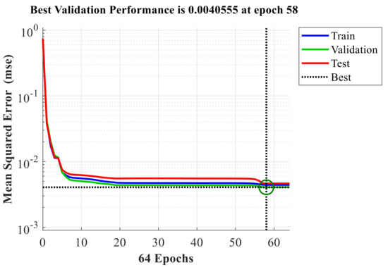 In the current section, the training results of the ML model are elaborated. The Levenberg–Marquardt (L.M.) optimizer is utilized for training the data. For the present study, two hidden layers are utilized with four neurons in each layer. The data set used for the current study is divided into three subsets, i.e., training validation and testing data sets. The training data set consists of 70% of the total data, while the remaining 30% is equally divided into validation and testing data sets. Figure 10 shows the mean squared error (MSE) values during the training process. The Figure shows that training of the data required only 58 epoch to achieve minimum mean squared error value. Further, it is obvious from the Figure 10 that the converged mean squared error values for the training, validation, and test set data are almost identical. This shows that the trained DNN model is not overfitting the data. It is to be noted here that two DNN models were trained for the Nu and the second for f. Further 10-fold cross-validation was used while training the ML model.