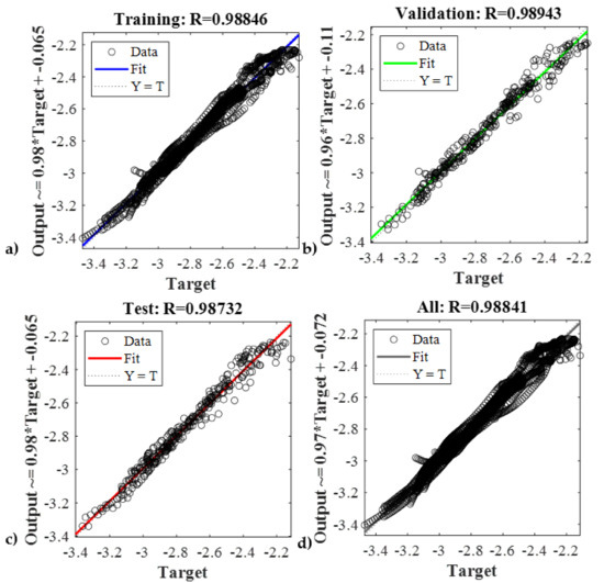 Figure 11 shows regression data for the friction factor, providing a comparison between the target and output values of training, validation, and testing data sets. Figure 11 shows R-values for the training data, validation, test, and the whole data set are 0.988, 0.989, 0.987, and 0.988, respectively. This shows that the trained model can predict 98.8% of the variability in the output data for the combined data set containing all data from training, validation, and test sets. At the same time, the capacity of the trained data ML model to estimate individual percentage variability for training, validation, and test data set is 98.8%, 98.9%, and 98.7%, respectively. At the same time, the R-value for the validation training and test data sets are almost identical; therefore, it can be inferred that the trained DNN model is not overfitting the data.