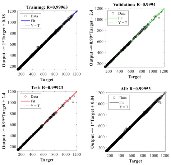 Figure 12 shows regression data for the Nusselt number values, supplying a comparison among the target and output values of training, validation, and testing data sets. It can be observed from Figure 12 that R-values for all data sets, i.e., training data, validation, test, and the whole data set, is 99.9. This signifies that the trained model can predict 99.9% of the variability in the output data for the combined data set containing all data from training, validation, and test sets. Similarly to the friction factor data, the R-value for the Nusselt number’s validation training and test data sets are almost identical. The trained DNN model is not overfitting the data.