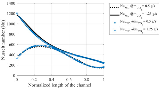 It is shown in the above section that the trained ML model is extremely accurate in predicting the complex heat transfer and pressure drop characteristics in the zigzag channel even when operating very close to the critical. Thus, the trained ML model is utilized in the recuperator and pre-cooler design and analysis code (RPDAC) to compute the realistic and accurate design of the recuperator and pre-cooler, as discussed in Section 4. To validate the in-house RPDAC data obtained from the published CFD calculation [5] was compared with the RPDAC calculation under the same operating condition. The comparison of RPDAC and CFD Nusslet number distribution along the channel length data is displayed in Figure 13. The comparison shows that RPDAC data is quite in agreement with the computed data using the 3D-RANS model. Further, the 3D-RANS model computation for a single simulation needs up to 10 to 26 on a high-performance computational (HPC) facility [5]. At the same time, RPDAC based on the DNN model can imitate the same simulation in 2 to 10 min only.