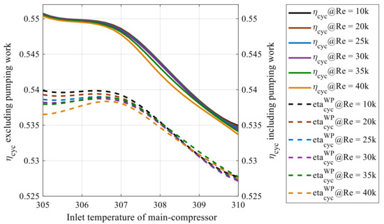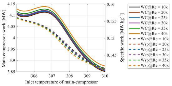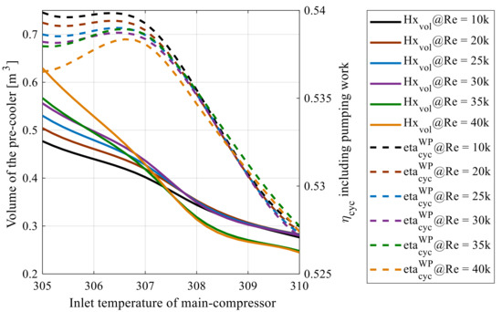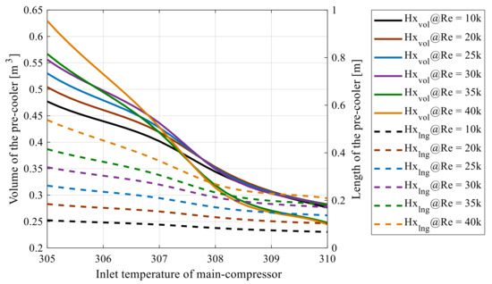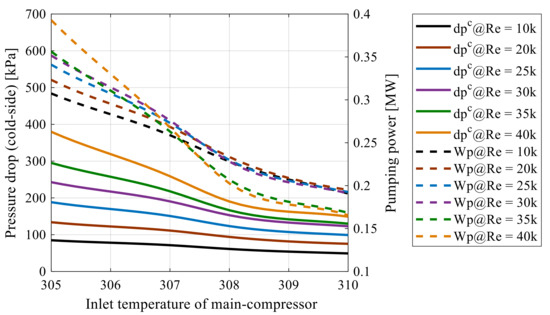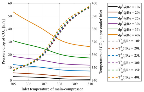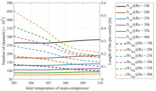 Figure 14 shows the pressure drop in the hot side of the pre-cooler at various imposed temperature conditions at the inlet and outlet of the pre-cooler by the cycle design point code. In Figure 14, the compressor’s inlet temperature is plotted on the graph’s horizontal axis while the inlet temperature on the CO2 sides and pressure drop in the pre-cooler are plotted on the right and left vertical axis. Figure 14 suggests that the inlet temperature of the pre-cooler increases with the increasing inlet temperature of the compressor. The inlet temperature of the pre-cooler is governed by the exit temperature of the low-temperature recuperator (LTR). The LTR exit temperature increases as it is linked with the exit temperature of the main compressor and split mass fraction. As the main compressor inlet temperature increases, its exit temperature and split mass fraction both increase as a result of an increase in the values of the inlet t temperature in the cold side of LTR; the exit temperature of the hot side of LTR (inlet temperature of the pre-cooler) increases. It can be observed that the inlet temperature of the pre-cooler increases substantially, i.e., 347 K to 396 K, by the increase in inlet temperature of the compressor from 305 K to 310 K. Because the inlet temperature of the compressor is the exit temperature of the pre-cooler, the difference along the pre-cooler would increase with the increase in the value of the compressor inlet temperature. At the same time, the pressure drop of the values corresponding to all values of the Reynolds number specified at the inlet of the pre-cooler decreases significantly with the increase in the value of the compressor’s inlet temperature. This is because of the high specific heat capacity (Cp) values near the critical point as discussed in the author’s previous work [5] and the smaller computed length of the pre-cooler are explained below. Further, it can be observed from the Figure that pressure drop increases substantially with the increase in the design value of the inlet Reynolds number, and the effect is more prominent at lower values of the compressor’s inlet temperature. On the other hand, the inlet temperature of the pre-cooler is not affected by the design value of the channel Reynolds number.