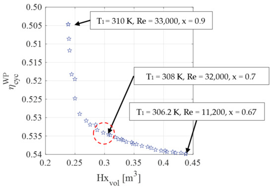 The geometry of the pre-cooler is optimized in the atmosphere of the power cycle employing cycle efficiency and the volume of the pre-cooler as two objective functions for the existing problem where the former is maximized and the latter is minimized. The optimization algorithm employed for the optimization study is a multiobjective genetic algorithm [28,29,30,31,32] in the environment of Matlab©. The CDPC embedded with RPDAC is utilized as a fitness function. In contrast, design variables studied for the present optimization study are exit temperature of the pre-cooler, channel’s Reynolds number on the hot side, and split mass fraction (x). It is to be noted here that the value of the split mass fraction is not a design parameter for the pre-cooler; however, the optimal value of x would change with the changing design of the pre-cooler. Therefore, the inclusion of x as a member of the design variables would result in the realistic optimization of the pre-cooler, as discussed in the author’s previous studies [20,27,33,34,35].