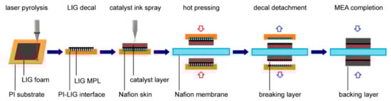 Graphic illustration of the stages of the LIG FC assembly procedure, including (left to right): laser pyrolysis of PI substrates for preparing the graphenic MPLs, catalyst ink spraying for preparing the CLs, hot pressing on a Nafion membrane, detachment of the sacrificial layers, and finally attachment of the backing layers. Reproduced with permission from [].