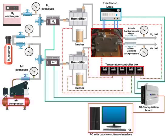 Experimental tests for the FC MEAs (bearing the LIG and the CB MPLs, respectively) were performed on a BekkTech BT-552 PEMFC testing station. All MEAs were tethered on bipolar plates bearing single serpentine channels. The testing station is comprised of the following primary systems: an Agilent 6060B 300 W DC electronic load, twin HPS® Series 937A mass flow controllers with RS-485 communication modules (MKS Instruments Inc., Andover, MA, USA), inlet and outlet pressure manometers (H2, N2 and air flows), twin heated and insulated gas lines, temperature controllers, and twin back pressure regulators. System purging before activation is performed with the nitrogen supply circuit, used to render inert possible flammable gas mixtures inside the ducts. Hydrogen used as the anodic flux was produced by electrolysis of distilled water using a PGH2-500 Plus electrolyzer (LNI Smidlin AG, Neuheim, Switzerland), which allows for producing 99.99% pure gas. An air compressor was used on the cathode side of the system. Reactant gases were humidified by the humidification subsystem based on dual temperature controllers, including output gas line heaters and on/off bypass valves. Relative humidity was controlled by adjusting the dew point temperature on the inlet flow. The overall cell temperature was measured by thermocouples installed within the end plates, which were in contact with control heaters—all connected to a central temperature control system. A control and data acquisition system built on LabVIEW (National Instruments) was used for interfacing, i.e., monitoring and control of all experimental parameters: temperature, flow rates, relative humidity of supplied gases, stoichiometry, cell voltage, and current load. The Piping and Instrumentation Diagram (P&ID) of the experimental set-up is outlined in Figure 2.