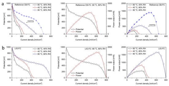 Experimental polarization curves and the net output power variations for the PEM fuel cell with MEAs based on laser-induced graphene MPL (LIG-FC) and carbon black MPL (Reference CB-FC) are presented in Figure 3. As we can see in Figure 3a, in the case of CB based MEA, fuel cell registered a very high activation losses and a quick flooding since the voltage suddenly dropped from 0.25 V to 0 V when the current density was increased from 150 to 200 mA/cm2. This phenomenon (produced at 40 °C and 80% RH) can be associated with a high amount of water, generated very fast at cathode catalyst layer (CCL) reaction sites, which accesses easily into GDL through the CB layer cracks and promotes its occlusion []. In contrast, CB MPL seem to conduct to a severe membrane dehydration at low humidity conditions of 40% RH under the fast voltage decreasing across the activation and mass transport regions of the polarization curve (see Figure 3b). An explanation on this behavior can be related again with the cracked surface morphology of GDL constructed with CB based MPL [,]. Most probably, for this CB MEA test performed at 80 °C and 40% RH, and also for the test developed at 80 °C and 80% RH (see Figure 3), the membrane failed to maintain a proper hydration level for efficient proton conduction. The reason should be a rapid water removal from the CCL/membrane interface regions through the wide and continuous network of cracks from CB MPL.