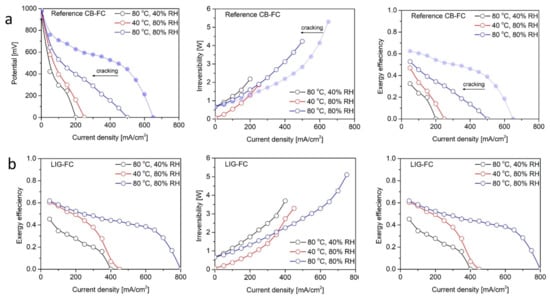 The voltage efficiency analysis results of the fuel cell are presented in Figure 4 for both types of MEA at the specific testing conditions. At optimum operating conditions of 80 °C and 80% RH for LIG-FC, between 51.3% and 42.5% of the available energy was converted into electricity when the current density varied in the range 150–400 mA/cm2 (see Figure 4b). As we can also observe in Figure 4a, in the same current load domain, the voltage efficiency of the Reference CB-FC was between 28.6% and 69% lower than for LIG-FC.