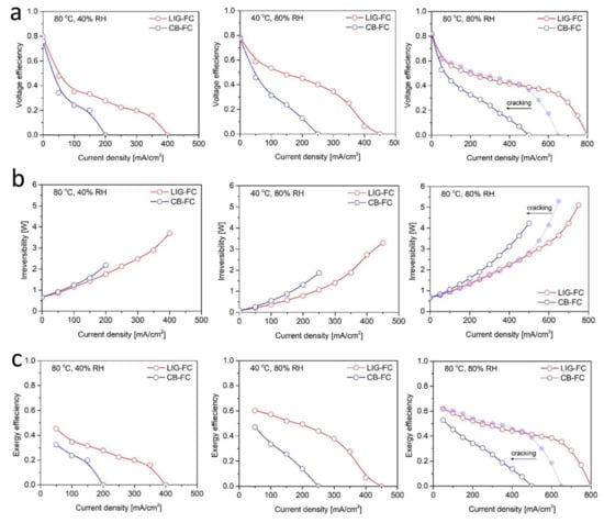Variations of voltage efficiency (a), thermodynamic irreversibility (b) and of exergy efficiency (c) versus current density for the fuel cell with LIG-based MEA and CB-based MEA at: 40 °C–80%RH, 80 °C–40%RH and 80 °C–80%RH (fresh CB–FC).