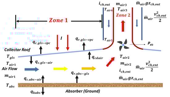 Illustrations of the energy balance equations of the SDCPP. Zone 1 is the solar air heating, and Zone 2 is the solar chimney and cooling tower (CT).