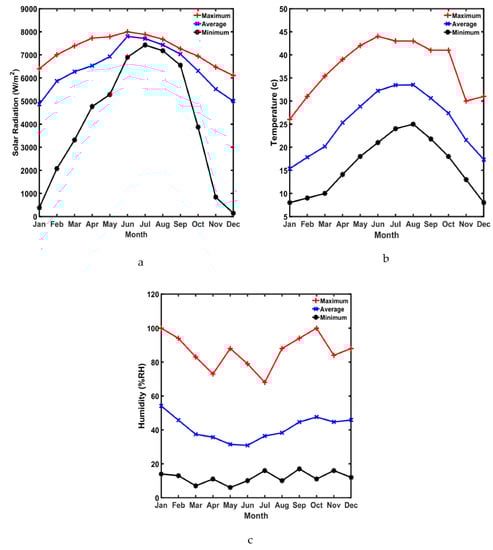 Monthly weather data (maximum, minimum and average) profiles for: (a) solar Irradiation, (b) temperature, and (c) humidity.