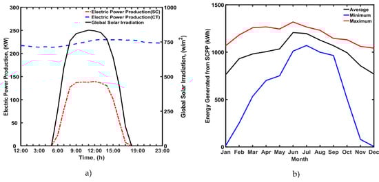 Table 3 presents representative values of the weather data for a regular summer day in July. The recorded results show that solar irradiation starts at 06:00 with an intensity of 256 W/m2 and ends at 17:00 with an intensity of 141 W/m2. The average daily solar irradiation is 5.53 kW/m2 in the winter and 7.61 kW/m2 in the summer. Figure 4a illustrates the minimum and maximum solar irradiation intensity in Aqaba all year. The average solar irradiation ranged from 4900 to 8050 W/m2, with the maximum value observed in June. There was a noticeable difference between the minimum and maximum solar irradiation in winter. The maximum difference in the winter was 6000 W/m2; the maximum difference in the summer was 1500 W/m2. This intensive solar irradiation in Aqaba represents promising renewable energy to produce electricity using the proposed SDCPP.