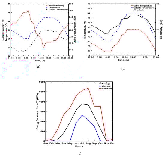 The temperature profiles of the ambient air and the air leaving the lower part of the SDCPP under CT mode are presented in Figure 6b. Both temperature profiles attained similar patterns with a 7 °C degree difference between air vapor and ambient temperature because of the cooling effect. The attained temperature profile suggests that the operation of the SDCPP under CT mode follows the character of the natural draft cooling profile. In addition, the heat exchange due to the evaporation of water droplets creates a dynamic flow inside the CT channels. Hence, maintaining the continuous movement of the turbine and thus contributes to the generated electrical energy. Sangi et al. [23] observed that the average velocity of the air in the outlet of the chimney decreases significantly, while the average temperature increases, and then the turbine rotational speed increases. It was indicated that under stable environmental parameters and constant solar radiation, the resistant force created by the blades leads to a decrease in the mass flow rate of air. Hence, the outlet air velocity would decrease accordingly. Moreover, the reduction in the air velocity might increase the chance for energy absorption from the system, leading to a sudden increase in the average temperature of the chimney outlet.