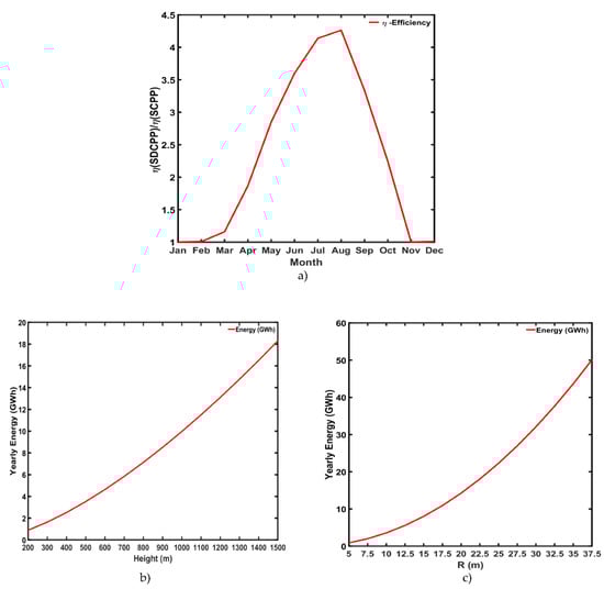 The monthly production of electrical power from the proposed design for one full year is presented in Table 4. The winter season (November to February) marked the lowest monthly electrical power (23,618 to 26,253 kWh) production. This was due to the low intercepted solar irradiation during these months. On the other hand, the summer months marked a significant improvement in the produced electrical power (up to 153,365 kWh). The production of electricity increases gradually by increasing the solar irradiation intensity and ambient temperature, which are favorable conditions for better SCPP operation. The results obtained suggest that the SDCPP produced 2.6-fold higher electrical power than the traditional SCPP. The significant improvement in the power generation can be related to the contribution of the 10 turbines in the secondary chimney. The table also showed that the power production from the CT is at its lowest in winter due to the low-temperature gradient and high humidity during the wintertime. The annual cumulative electricity (993 MWh) from the new proposed design is higher than the conventional SCPP (377 MWh).