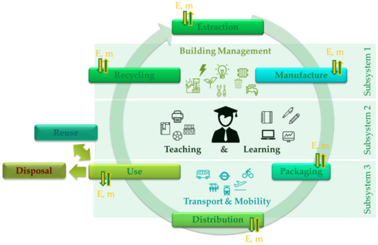 Figure 1 depicts the LCA scheme of the school system. The student is the core of the school system and the reference unit used in this assessment. Icons represent the different products and services needed for the provision of the necessary conditions for the education of students in every school that are clustered in the three subsystems mentioned. The life cycle of the school system includes the input of material and energy, as well as the output of emissions, effluents, and residues to the environment (input and output arrows) at any stage of the production chain (extraction of raw materials, manufacture, packing, distribution, end of life pathway). Table 2, Table 3 and Table 4 detail the activities included in the three subsystems considered.