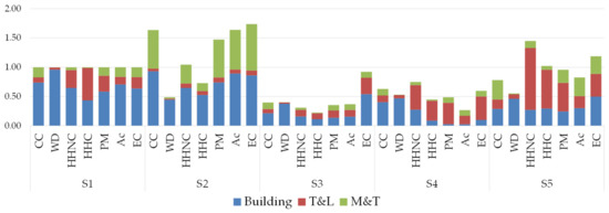 Contribution of subsystems—buildings, training, and learning (T&L), and mobility and transport (M&T) of the sample of schools (S1, S2, S3, S4m and S5) to the results of the assessment of environmental impacts and external costs. CC: climate change; WD: water depletion; HH: human health (HHNC: non-cancer effects and HHC: cancer effects); PM: particulate matter; AC: acidification; EC: external costs. The vertical axis represents the impact result of each school and impact category normalized by the results of School 1 (S1), establishing the proportional size related to this school (S1 = 1).