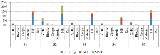 External costs (EC) results whole school (S1, S2, S3, S4, and S5) per student classified by the receptor affected and the damage caused (GHG: greenhouse gases damage; Biodiv: loss of biodiversity; crops: yields affection and deposition over crops; material: materials corrosion and degradation; HH: human health affection; Rad: radionuclides emission).